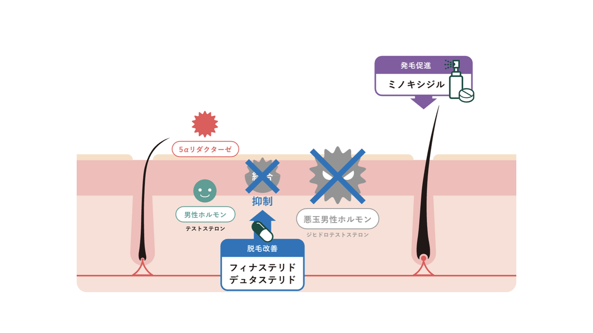 - 男性ホルモン(テストステロン)が、抜け毛の原因とされるDHT(ジヒドロテストステロン)に変換されることを阻止することで、脱毛の進行を止めるお薬です。